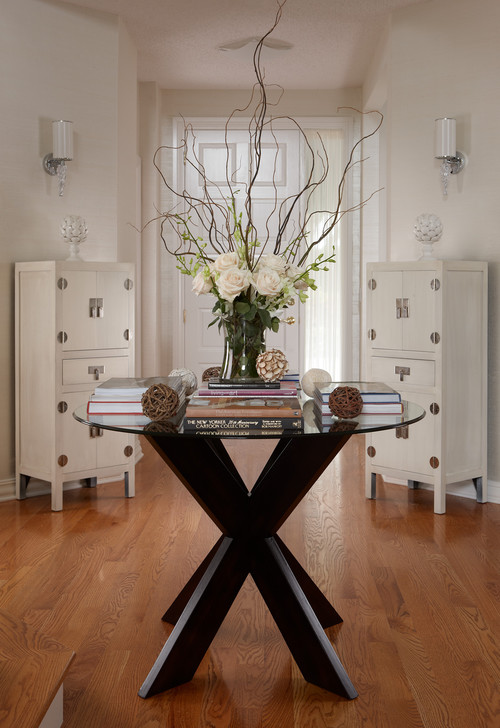 In the spring and summer, decorate with bright flowers or fresh fruit in a clear glass vessel.