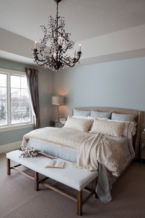 A popular decorating idea used by interior designers is to have an amazing chandelier over the bed to make the bed an even more amazing focal point.