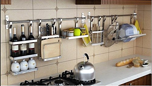 Rails and hooks are very popular for holding large utensils and other larger items used often.