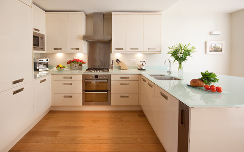 Solid glass countertops are a high priced kitchen countertop option that is a unique modern option for countertops, especially if they are lit from underneath.