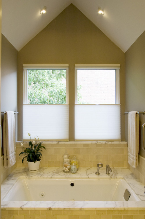 Consider using shades that open at the top to allow light in the bathroom while still providing privacy.