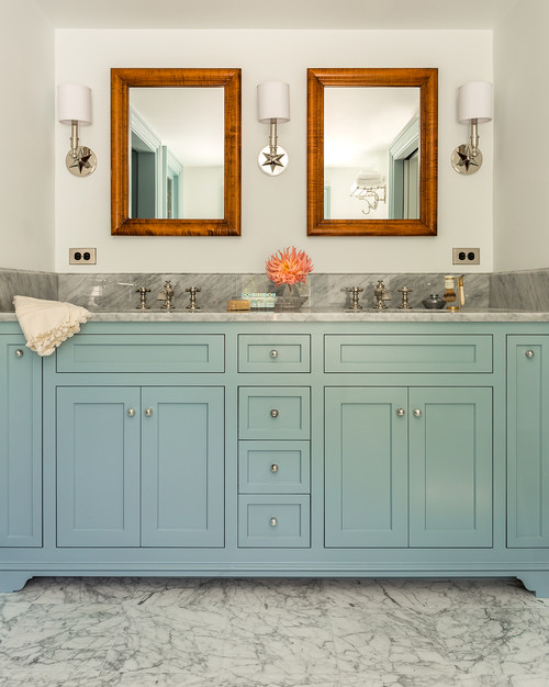 If bold colors are a bit intimidating, consider bringing in warm wood tones to make your bathroom feel less sterile.