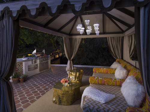 A fun option for outdoor lighting is stylish string lights hung across the patio and into the trees.
